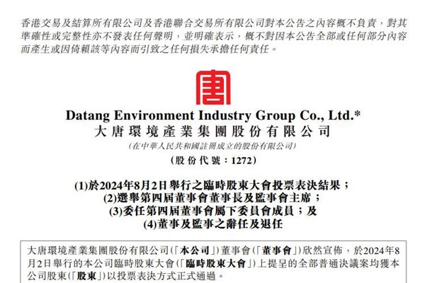 大唐环境近日公告称,紧接临时股东大会后举行的董事会会议,董事会一致选举朱利明先生担任第四届董事会董事长。朱利明先生的任期与其董事职务任期一致。紧接临时股东大会后,监事会一致选举柳立明先生出任第四届监事会主席,其任期与其监事职务任期一致。 于临时股东大会上股东批准董事及监事的委任后,王俊启先生、吴大庆先生、陈侃先生、叶翔先生及高家祥先...