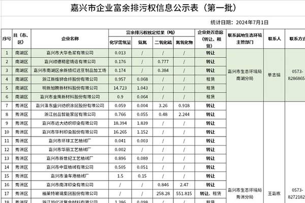 为进一步健全排污权要素市场化配置体系,拓宽企业信息共享通道,提高二级市场交易效率,嘉兴市生态环境局构建了“全市企业富余排污权动态清单库”。经梳理核定,现公布第一批富余排污权企业信息,有购买、租赁等需求的企业可联系县(市、区)生态环境分局了解详情。 原标题:企业富余排污权信息公示...