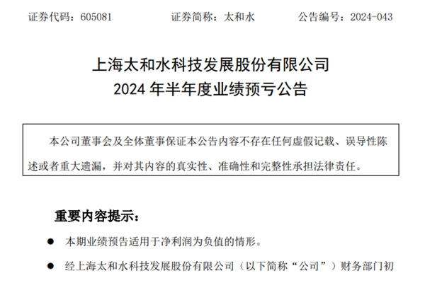 上海太和水科技发展股份有限公司成立于2010年,并于2021年2月9日正式于上交所上市。公司所属生态保护和环境治理业,主营业务:采用生物-生态方式对富营养化水体进行水环境生态修复与构建。 2024年7月10日,上海太和水科技发展股份有限公司发布《2024 年半年度业绩预亏公告》。公告显示,经公司财务部门初步测算,预计 2024 年半...