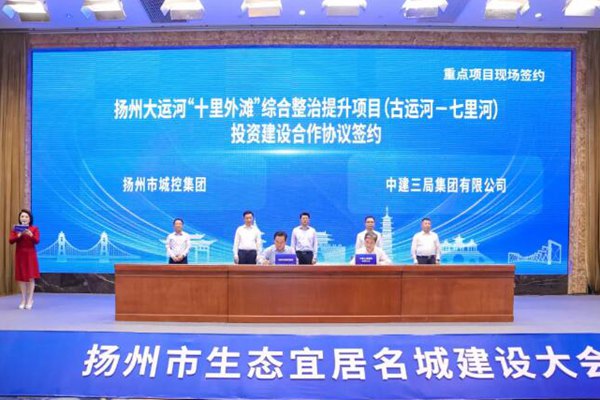 5月24日,扬州市生态宜居名城建设大会上,中建三局与扬州城控集团签订扬州大运河“十里外滩”综合整治提升项目投资建设合作协议。扬州市委书记王进健出席会议并讲话,市委副书记、市长潘国强主持会议。扬州城控集团党委书记、董事长张思忠,党委副书记、副董事长、总经理潘涵,中建三局党委副书记、总经理周圣应邀出席大会及签约仪式...