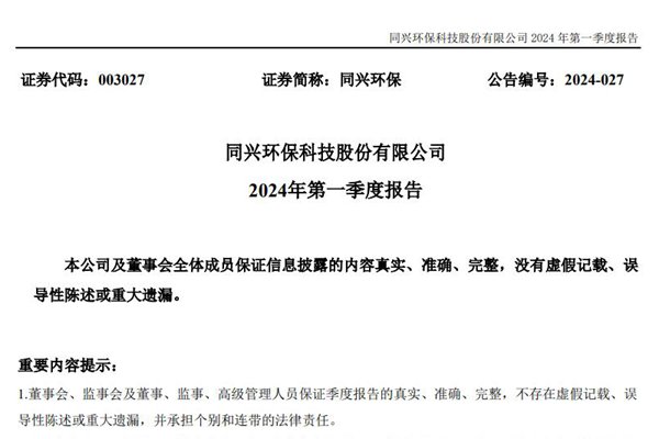 同兴环保科技股份有限公司(简称:同兴环保)近日发布2024年第一季度报告,报告期内公司实现营业收入1.03亿元,同比减少28.49%;归属于上市公司股东的净利润842.42万元,同比减少68.75%;归属于上市公司股东扣除非经常性损益净亏损411.67万元;基本每股收益0.06元/股。 据悉,在一季度,同兴环保控股子公司马鞍山皓升已...
