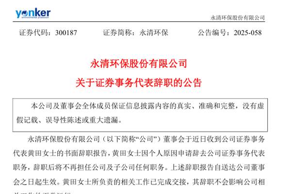 永清环保股份有限公司(简称:永清环保)公告称,公司董事会于近日收到公司证券事务代表黄田女士的书面辞职报告,黄田女士因个人原因申请辞去公司证券事务代表职务,辞职后将不再担任公司及子公司任何职务。目前,黄田女士所负责的相关工作已完成交接,其辞职不会影响公司相关工作的正常运行。图源:永清环保公告 公开资料显示,永清环保成立于2004年,已...