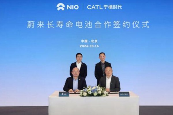 3月14日,蔚来与宁德时代在北京签署框架协议,双方将基于换电场景,推动长寿命电池研发创新。蔚来副总裁曾士哲与宁德时代国内乘用车事业部CTO高焕代表双方签约。蔚来高级副总裁、蔚来驱动科技CEO曾澍湘与宁德时代乘用车事业部执行总裁朱威见证签约。 蔚来是全球最大的智能电动汽车换电网络运营商,在全球市场建设和运营超2300座换电站。在动力电...