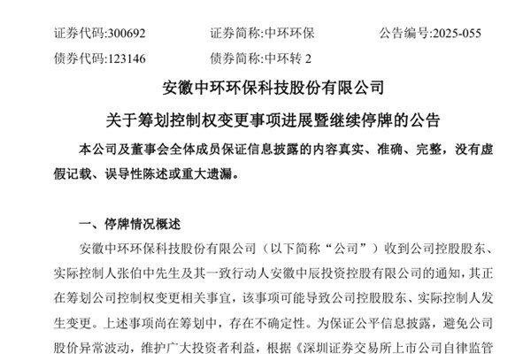 安徽中环环保科技股份有限公司(简称:中环环保)公告称,公司预计无法在2025年10月9日(星期四)开市起复牌。鉴于控制权变更事项尚在筹划中,存在不确定性。为保证公平信息披露,维护投资者利益,避免公司股价异常波动,公司股票及可转换公司债券自2025年10月9日(星期四)开市起继续停牌,预计停牌时间不超过3个交易日。公司可转换公司债券&l...