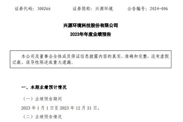 兴源环境科技股份有限公司(简称:兴源环境)近日发布《2023年年度业绩预告》,预计归属于上市公司股东的净利润亏损8.5亿元-9.5亿元,上年同期亏损约5.5亿,金额进一步扩大;扣除非经常性损益后的净利润亏损8.4亿元-9.4亿元,上年同期亏损约5.6亿元。 公告中,兴源环境对经营业绩亏损原因做出了说明,主要系新业务拓展、部分工程项目...