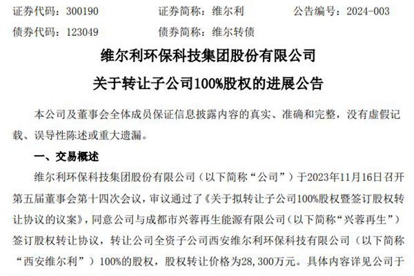 近日,维尔利环保科技集团股份有限公司(简称:维利尔)发布公告称,公司收到了西安市政府有关部门关于转让西安维尔利环保科技有限公司(简称“西安维尔利”)100%股权予成都市兴蓉再生能源有限公司(简称“兴蓉再生”)的批复文件并完成了西安维尔利的工商变更登记手续。 未来,西安维尔利的股东将由...