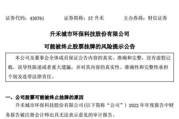 1月2日,在“新三板”挂牌交易的升禾城市环保科技股份有限公司(简称:ST升禾)发布2024年首份公告,表示公司股票可能被“终止挂牌”。 公告显示,由于ST升禾2022年财务报告已被出具“无法表示意见的审计报告”,若2023年度财务报告再度被注册会计师出具否定意见...
