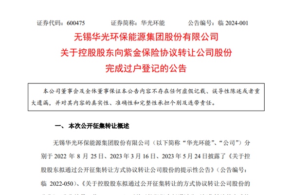 无锡华光环保能源集团股份有限公司近日公告称,公司控股股东向紫金保险协议转让公司股份完成过户登记。 此前,公司控股股东无锡市国联发展(集团)有限公司分别与本次公开征集转让股份的受让方中国国有企业结构调整基金二期股份有限公司、紫金财产保险股份有限公司签署了附条件生效的《股份转让协议》,约定国联集团向国调基金二期转让所持有的华光环能 13...