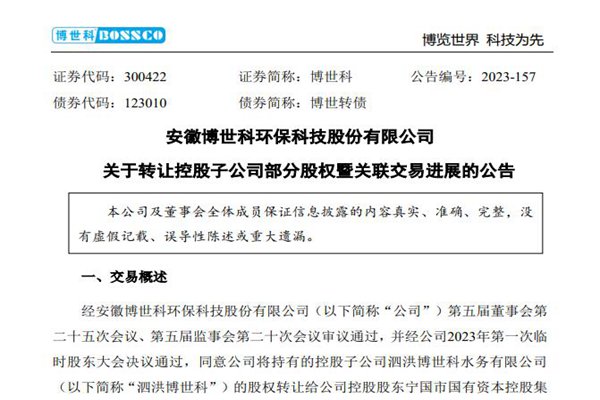近日,安徽博世科环保科技股份有限公司(简称:博世科)发布公告,表示将转让持有的控股子公司泗洪博世科水务有限公司股权给公司(下称:泗洪博世科)控股股东宁国市国有资本控股集团有限公司(下称“宁国国控”),所得款项将用于补充流动资金、归还银行贷款、项目投资建设等与公司日常经营相关的事项。 公告显示,泗洪博世科成立于...