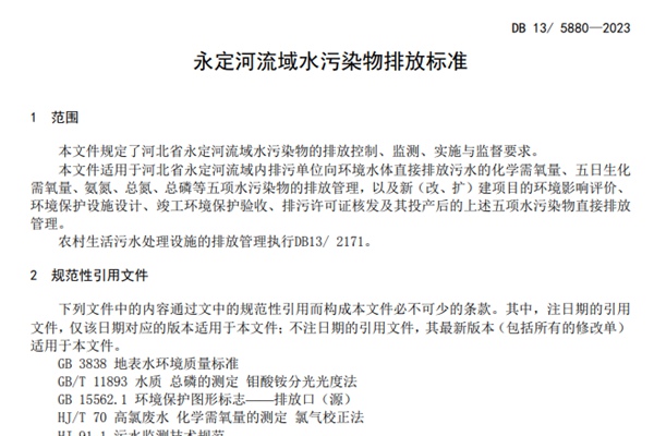 由河北省生态环境厅提出并归口,《永定河流域水污染物排放标准》(DB 13/ 5880—2023)日前发布,自2024年1月1日实施。本文件规定了河北省永定河流域水污染物的排放控制、监测、实施与监督要求,适用于河北省永定河流域内排污单位向环境水体直接排放污水的化学需氧量、五日生化 需氧量、氨氮、总氮、总磷等五项水污染物的排放...