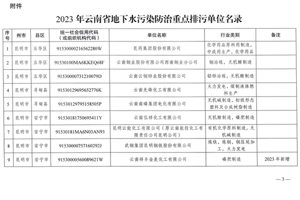 经征求各州(市)相关意见,云南省生态环境厅对2023年云南省地下水污染防治重点排污单位名录进行更新,并要求有关单位监督、指导各重点排污单位依法安装水污染物排放自动监测设备,与生态环境主管部门的监控设备联网,并保证监测设备正常进行;推动纳入排污许可管理,加强防渗、地下水环境监测、执法检查。根据名录内容显示,2023年新增地下水污染防治重...