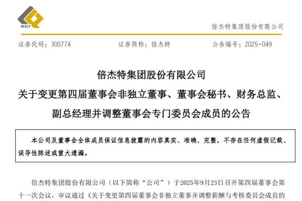 倍杰特集团股份有限公司(简称:倍杰特)公告称,公司于2025年9月23日召开第四届董事会第十一次会议,审议通过《关于变更第四届董事会非独立董事并调整薪酬与考核委员会成员的议案》《关于聘任董事会秘书、财务总监的议案》《关于聘任副总经理的议案》: ①提前离任的基本情况图源:倍杰特公告 ②选举第四届董事会非独立董事、董事会专门委员会委员...