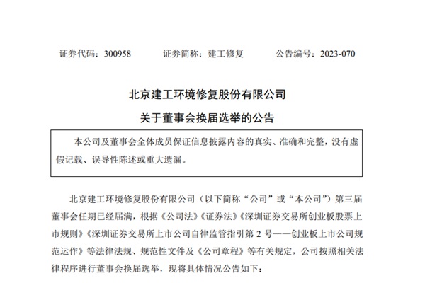 2023年10月13日,建工修复发布《关于董事会换届选举的公告》,公告提及,公司于2023年10月11日召开第三届董事会第二十七次会议,审议通过了《关于提名公司第四届董事会非独立董事候选人的议案》、《关于提名公司第四届董事会独立董事候选人的议案》,公司董事会同意提名路刚先生、李文波先生、原波先生、李笑雪女士、迟晓燕女士为公司第四届董事...