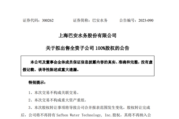 2023年10月10日,上海巴安水务股份有限公司(下称“巴安水务”),公司拟出售全资子公司 Safbon Water Technology, Inc.(下称“SWT”)的100%股权,股权转让完成后公司将不再持有SWT的股权,其也将不再纳入公司合并报表范围。 近日,巴安水务表示,为优化...