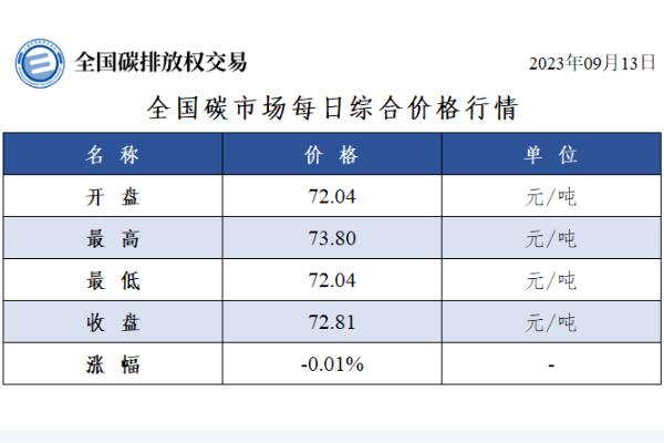 9月13日全国碳市场综合价格行情为: 开盘价72.04元/吨,最高价73.80元/吨,最低价72.04元/吨,收盘价72.81元/吨,收盘价较前一日下跌0.01%。 9月13日挂牌协议交易成交量219,424吨,成交额15,965,546.00元;大宗协议交易成交量659,000吨,成交额44,133,500.00元。 13日全国...