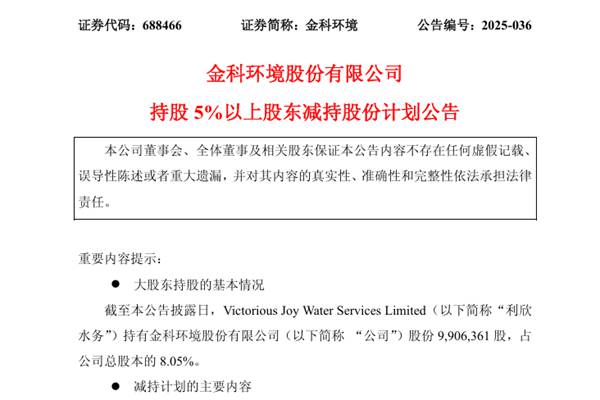 金科环境股份有限公司(简称:金科环境)近日公告称,因自身资金需求,公司持股5%以上股东Victorious Joy Water Services Limited 发来了减持计划,计划通过集中竞价交易的方式减持公司股份不超过1,231,190股,即不超过公司总股本的1%,自本公告披露之日起15个交易日后的3个月内进行,拟减持期间为202...