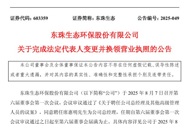 东珠生态环保股份有限公司(简称:东珠生态)近日公告称,公司已完成工商变更登记手续,并取得了无锡市数据局换发的《营业执照》,公司法定代表人变更为席惠明先生。 据悉,东珠生态于2025年8月7日召开第六届董事会第一次会议,会议审议通过了《关于聘任公司总经理及其他高级管理人员的议案》,同意聘任席惠明先生为公司总经理,任期自第六届董事会第一...