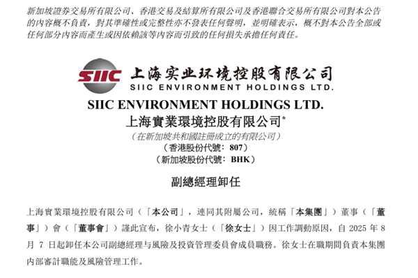 上海实业环境控股有限公司(简称:上海实业环境)近日公告称,徐小青女士因工作调动原因,自2025年8月7日起卸任本公司副总经理与风险及投资管理委员会成员职务。徐女士在职期间负责本集团内部审计职能及风险管理工作。图源:上海实业环境公告 据悉,上海实业环境主营业务聚焦于污水处理、供水、污泥处理、固废焚烧发电及其他环保领域&zw...