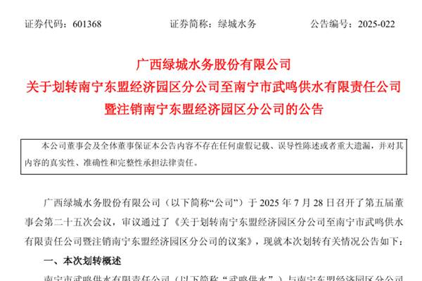 广西绿城水务股份有限公司(简称:绿城水务)近日公告称,南宁市武鸣供水有限责任公司(下称“武鸣供水”)与南宁东盟经济园区分公司(下称“东盟分公司”)为公司下属的两个自来水生产单位,均地处武鸣区,服务范围毗邻,管网已实现联通,业务关联度较高。为进一步优化公司资源配置,提升管理及运营效率,增强...