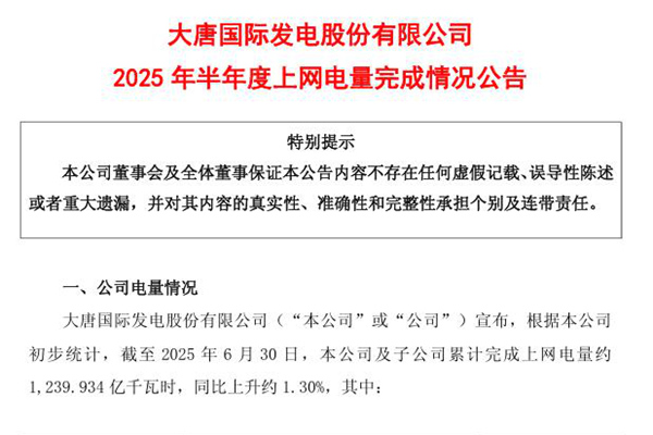 2025年07月18日,大唐国际发电股份有限公司发布《2025 年半年度上网电量完成情况公告》。图源:大唐发电公告 截至2025年6月30日,公司及子公司累计完成上网电量约1,239.934 亿千瓦时,同比上升约1.30%。其中,风电上网电量112.382亿千瓦时,同比增长 31.27%;光伏上网电量35.573亿千瓦时,同比增长3...