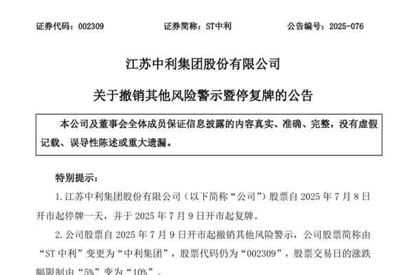 7月8日,江苏中利集团股份有限公司(下称“中利集团”)公告称,公司股票自2025年7月8日开市起停牌一天,并于2025年7月9日开市起复牌。公司股票自2025年7月9日开市起撤销其他风险警示,公司股票简称由“ST 中利”变更为“中利集团”,股票代码仍为&ldquo...