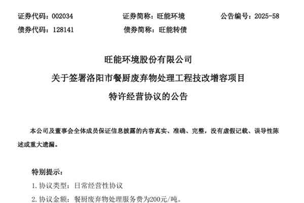 旺能环境股份有限公司(简称:旺能环境)近日公告称,洛阳旺能再生能源有限公司(下称“洛阳旺能”)与洛阳市城市管理局就上述中标事项正式签署《洛阳市餐厨废弃物处理工程技改增容项目特许经营协议》,确定由洛阳旺能依照本协议对洛阳市餐厨废弃物处理工程技改增容项目进行投资、融资、建设、运营和维护维修等。 协议主要内容 1...