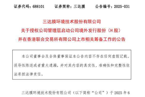 6月17日,三达膜环境技术股份有限公司(简称:三达膜)发布公告称,公司拟在境外发行股份(H股)并在香港联合交易所有限公司(下称“香港联交所”)上市。三达膜表示,此次H股上市旨在加快构建公司国内国际双循环格局,推进公司海外战略布局,进一步提升公司品牌形象及知名度,提高公司的资本实力和综合竞争力。 据悉,近两年,...