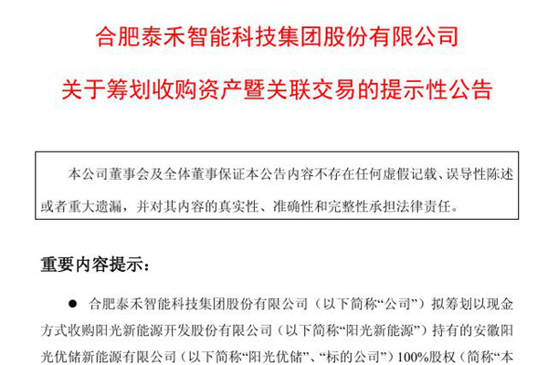 2025年06月17日,合肥泰禾智能科技集团股份有限公司发布《关于筹划收购资产暨关联交易的提示性公告》。图源:泰禾智能公告 泰禾智能拟筹划以现金方式收购阳光新能源开发股份有限公司持有的安徽阳光优储新能源有限公司100%股权,交易价格不超过5,000.00万元。 公告做了跨界经营风险提示:公司现有业务主要为智能分选装备业务。标的公司...