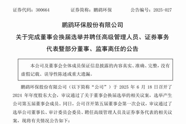鹏鹞环保股份有限公司(简称:鹏鹞环保)公告称,6月18日公司召开了2024年年度股东大会,审议通过了关于董事会换届选举的相关议案,选举产生公司第五届董事会成员。同日,公司召开第五届董事会第一次会议,审议通过了选举公司董事长、审计委员会委员、聘任高级管理人员及证券事务代表的相关议案。详情如下↓ 一、第五届董事会组成情况 公...