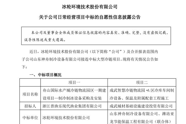 2025年06月11日,冰轮环境技术股份有限公司发布《关于公司日常经营项目中标的自愿性信息披露公告》。图源:冰轮环境公告 近日,冰轮环境技术股份有限公司及合并报表范围内子公司山东神舟制冷设备有限公司接连中标大型冷链项目。 冷链系统是公司的优势业务板块之一,公司拥有 “国家认定企业技术中心”和国家级绿色工厂,...