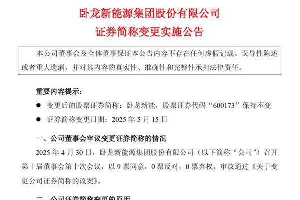 2025年4月24日,卧龙资源集团股份有限公司发布公告,公司名称变更为卧龙新能源集团股份有限公司完成工商变更登记。5月10日,公司再次发布公告,公司简称自5月15日起由“卧龙地产”变更为“卧龙新能”,股票证券代码保持不变。图源:卧龙新能源集团股份有限公司公告 公告表示,公司3月完成收购...