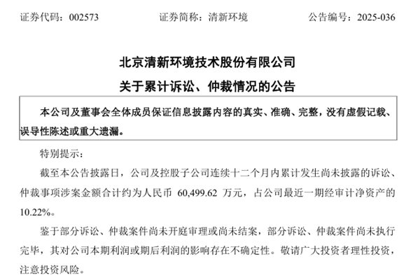 北京清新环境技术股份有限公司(简称:清新环境)近日发布《关于累计诉讼、仲裁情况的公告》,截至本公告披露日,公司及控股子公司连续十二个月内累计发生尚未披露的诉讼、仲裁事项涉案金额合计约为人民币 60,499.62 万元,占公司最近一期经审计净资产的10.22%。其中,公司及控股子公司作为原告涉及的诉讼、仲裁案件金额合计约为人民币40,3...