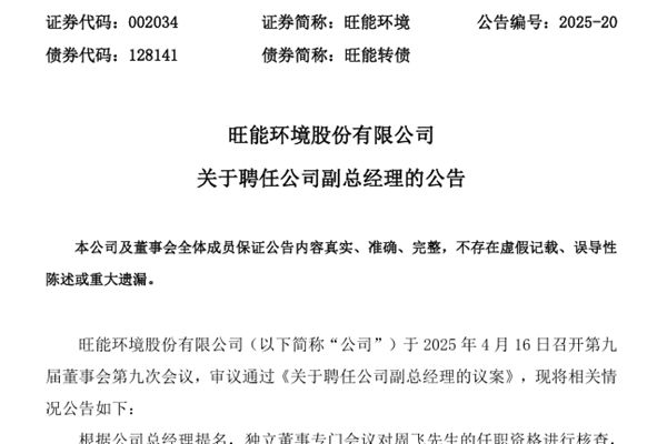 4月17日,旺能环境股份有限公司(简称:旺能环境)发布公告称,根据公司总经理提名,独立董事专门会议对周飞先生的任职资格进行核查,董事会同意聘任周飞先生为公司副总经理,至本届董事会期满之日止。 周飞,男,中国国籍,1982 年生,本科学历,高级经济师,历任淮北宇能热电有限公司财务总监;许昌天健热电有限公司财务总监、常务副总经理、总经理...