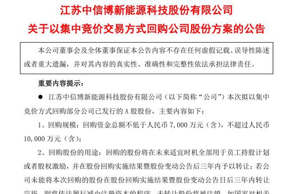 2025年04月17日,江苏中信博新能源科技股份有限公司发布《关于以集中竞价交易方式回购公司股份方案的公告》。图源:中信博公告 本次拟以集中竞价方式回购部分公司已发行的A股股份。 1、回购规模:回购资金总额不低于人民币7,000万元(含),不超过人民币10,000 万元(含); 2、回购股份的用途:回购的股份将在未来适宜时机全...