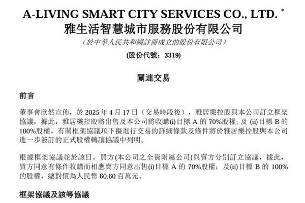 2025年4月17日,雅生活智慧城市服务股份有限公司发布《关联交易》公告。图源:雅生活服务公告 雅居乐控股与雅生活服务签订框架协议,出售安徽安普环保科技有限公司70%股权和聊城雅居乐环保科技有限公司100%股权,总对价为6060万元。 此次交易完成后,安普环保和聊城雅居乐环保成为雅生活服务的附属公司,其财务资料将合并至雅生活服务...