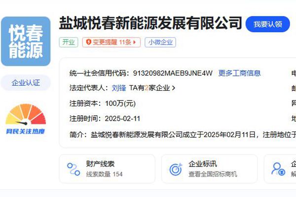 2月11日,盐城悦春新能源发展有限公司成立,法定代表人为刘锋,注册资本100万元,经营范围包含: 【许可项目】:发电业务、输电业务、供(配)电业务;建设工程施工;输电、供电、受电电力设施的安装、维修和试验(依法须经批准的项目,经相关部门批准后方可开展经营活动,具体经营项目以审批结果为准) 【 一般项目】以自有资金从事投资活动;租赁...