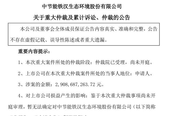 2025年02月20日,中节能铁汉生态环境股份有限公司发布《关于重大仲裁及累计诉讼、仲裁的公告》。图源:中节能铁汉公告 公告显示,因融资借款合同纠纷,中节能铁汉向中国国际经济贸易仲裁委员会华南分会提出仲裁,请求贵州钟山开发建设有限公司向其支付本息合计2,908,687,263.72 元。国际仲裁华南分会已受理该案件并已完成仲裁庭的组...