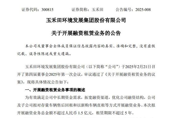 玉禾田环境发展集团股份有限公司(简称:玉禾田)近日公告称,为有效满足公司中长期资金需求,拓宽融资渠道,优化公司融资结构,公司及子公司拟对存量车辆售后回租和以新购车辆直租等方式开展融资业务。本次拟开展融资业务总金额不超过人民币 1.5 亿元,租赁期限不超过 5 年。 玉禾田认为,公司及子公司开展融资租赁业务,能够有效盘活存量资产,扩宽...