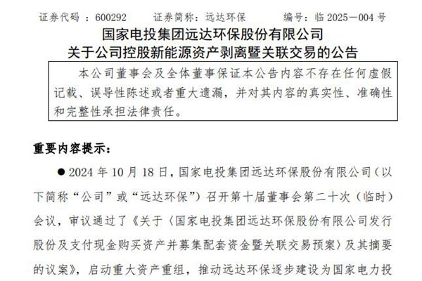 国家电投集团远达环保股份有限公司(简称:远达环保)2月11日公告称,为打造国家电投集团水电资产整合平台,聚焦核心业务,公司拟对控股的新能源资产进行剥离。本次新能源资产剥离涉及 13 个项目,资产剥离路径包括:公开挂牌、项目注销、向承接方协议转让或承接方预收购等多种方式。因交易对方为国家电投集团所属重庆汇智能源有限公司(以下简称汇智能源...