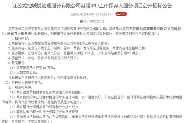 1月27日,江苏龙控城悦管理服务有限公司港股IPO上市保荐人服务项目公开招标公告发布,服务内容包含但不限于上市辅导、保荐、承销、发行等全过程服务,服务期限自合同签订生效之日起,至招标人港股 IPO 上市工作全部结束之日后3个月止,最高限价为保荐服务费人民币400万元,承销费率3.5%。 公开资料显示,江苏龙控城悦管理服务有限公司是地...