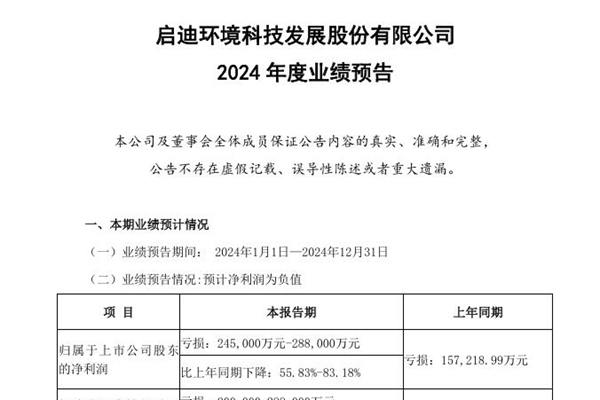 2025年1月21日,启迪环境科技发展股份有限公司发布《2024 年度业绩预告》。图源:启迪环境公告 归属于上市公司股东的净利润预计亏损245,000万元-288,000万元,比上年同期下降55.83%-83.18%,营业收入490,000万元-540,000万元。 亏损的主要原因如下: 1、参股公司桑顿新能源科技有限公司持续大...