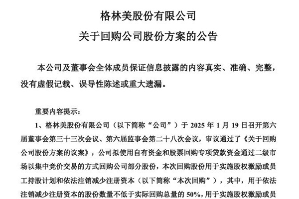2025年1月21日,格林美股份有限公司发布《关于回购公司股份方案的公告》。图源:格林美公告 本次回购股份的价格为不超过人民币 9.93 元/股(含),本次回购的资金总额不低于10,000万元人民币(含)且不超过20,000万元人民币(含)。在回购股份价格不超过 9.93 元/股的条件下,若按回购资金总额上限和回购股份价格上限进行测...