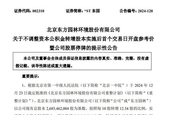 北京东方园林环境股份有限公司(简称:*ST东园,下称“东方园林”)12月27日公告称,公司将以现有总股本 2,685,462,004 股为基数,按照每 10 股转增 12.34 股的比例,实施资本公积金转增股本,预计转增 3,313,860,113 股。转增后东方园林总股本将增加至5,999,322,117 股...