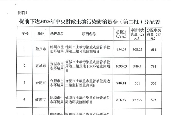 安徽省财政厅和安徽省生态环境厅提前下达第一批和第二批2025年中央财政土壤污染防治资金,第一批分配2个项目——合肥庐江县龙桥镇新建村历史遗留废渣污染治理项目(2431万元),宣城泾县榔桥镇乌溪金矿土壤污染源头综合治理项目(3430万元)。 第二批分配6个项目,合计4277万元。...
