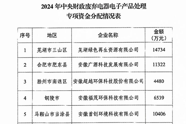 安徽省财政厅 安徽省生态环境厅关于下达2024年废弃电器电子产品处理专项资金预算的通知 有关市、县(区)财政局、生态环境局: 根据《财政部关于下达2024 年废弃电器电子产品处理专项资金预算的通知》(财资环[2024] 138 号),为支持废弃电器电子产品回收处理,现下达你市、县(区) 2024年中央财政废弃电器电子产品处理专项资金,...