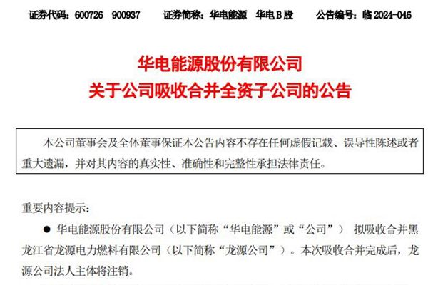 华电能源股份有限公司(简称:华电能源)近日公告称,公司拟吸收合并黑龙江省龙源电力燃料有限公司(下称“黑龙江龙源电力”)。本次吸收合并完成后,黑龙江龙源电力法人主体将注销。 本次吸收合并不构成关联交易,也不构成《上市公司重大资产重组管理办法》规定的重大资产重组。对公司财务状况和经营成果无实质性影响,不存在损害公...