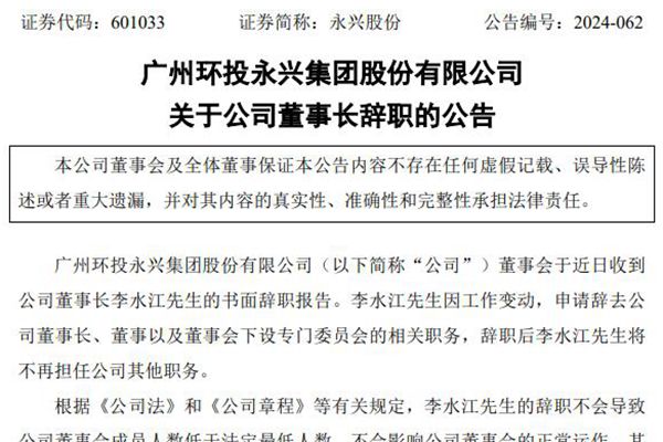 广州环投永兴集团股份有限公司(简称:永兴股份)12月10日公告称,李水江先生因工作变动,申请辞去公司董事长、董事以及董事会下设专门委员会的相关职务,辞职后李水江先生将不再担任公司其他职务。 根据《公司章程》规定,经董事会全体董事共同推举,在选举产生新任董事长前由董事张雪球先生代为履行董事长职责,公司将按照相关规定尽快完成董事补选及新...
