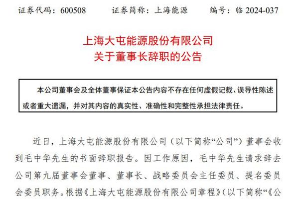 上海大屯能源股份有限公司(简称:上海能源)近日发布《关于董事长辞职的公告》,因工作原因,毛中华先生请求辞去公司第九届董事会董事、董事长、战略委员会主任委员、提名委员会委员职务。辞职后,毛中华先生不再担任上海能源及控股子公司任何职务。 上海能源,是由大屯煤电(集团)有限责任公司作为主发起人,联合中国煤炭进出口公司、宝钢集团国际经济贸易...