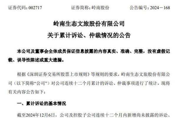 岭南生态文旅股份有限公司(简称:岭南股份)12月7日发布《关于累计诉讼、仲裁情况的公告》,截至2024年12月6日,公司及控股子公司连续十二个月内新增尚未披露的诉讼、仲裁事项的涉案金额合计约为27,145.86万元,涉案金额累计达公司最近一期经审计归属于母公司净资产的12.90%。 岭南股成立于1998年,于2014年上市。经过20...