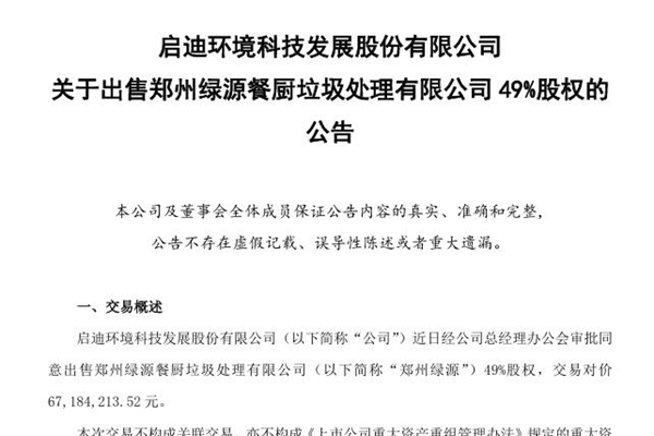 2024年12月03日,启迪环境科技发展股份有限公司发布《关于出售郑州绿源餐厨垃圾处理有限公司49%股权的公告》。图源:启迪环境公告 公告明确,启迪环境与山高十方环保能源集团有限公司同意以现金方式收购出让/受让郑州绿源餐厨垃圾处理有限公司49%股权,作价67,184,213.52元。各方确认,截至审计基准日,关联方债务为11,289...